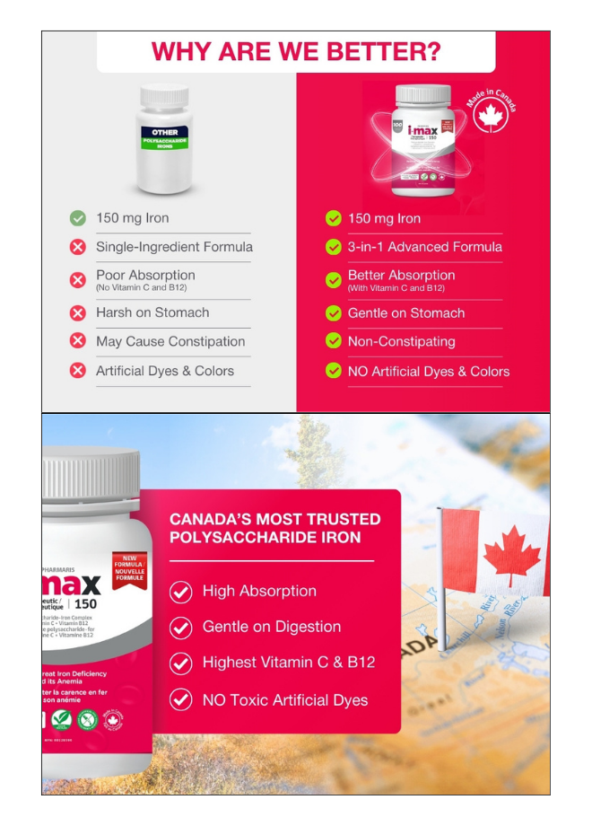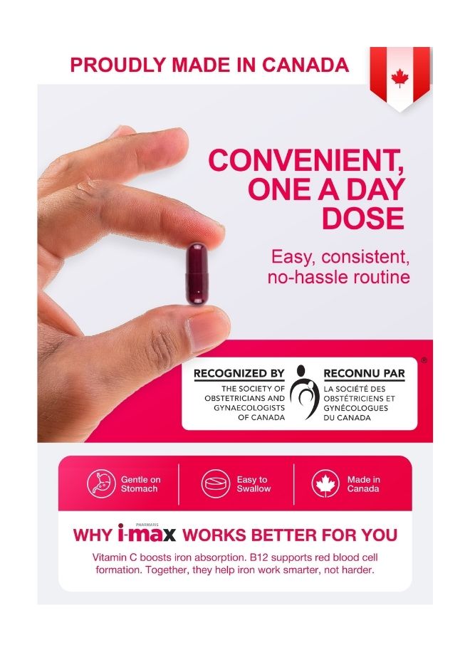 Pharmaris i-max delivers high-absorption polysaccharide iron with Vitamin C and B12 to restore iron levels and support real, noticeable energy.